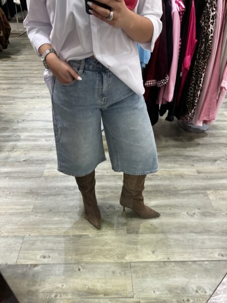 40,00 €Bermuda en jean prendre sa taille habituelle Deux poches à l’avant et à l’arrière Fermeture éclair + un bouton Composition : 63 % coton, 32 % polyester 2 % viscose 3 % elastane Lavage à 30° repassage sur l’envers  Fabriqué en Chine
