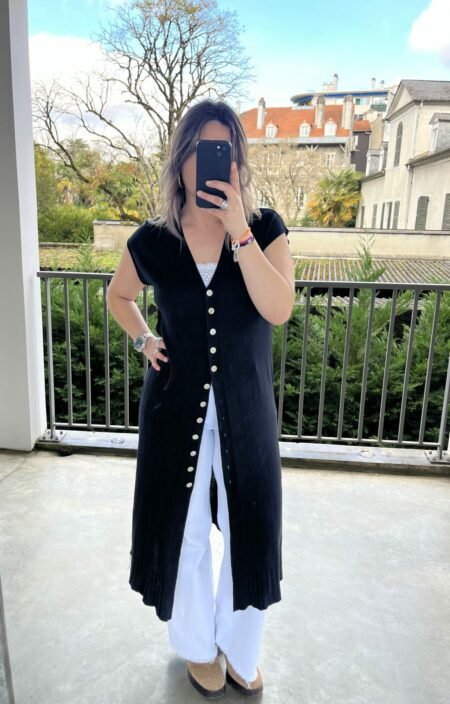 Notre gilet sans manches en laine d’alpaga incarne la légèreté et le confort avec une coupe loose qui épouse le mouvement. Son tombé souple et sa texture moelleuse offrent une allure décontractée mais toujours raffinée.Les boutons en nacre ajoutent une touche lumineuse, contrastant délicatement avec la texture duveteuse de la maille. À porter ouvert sur une chemise, fermé sur un top fin ou superposé à une robe, il s’adapte à toutes les saisons et à tous les styles.