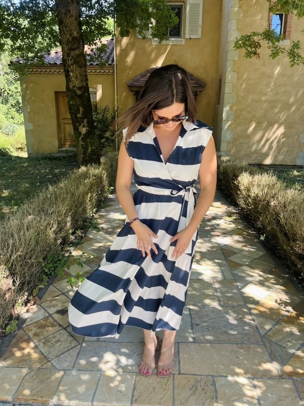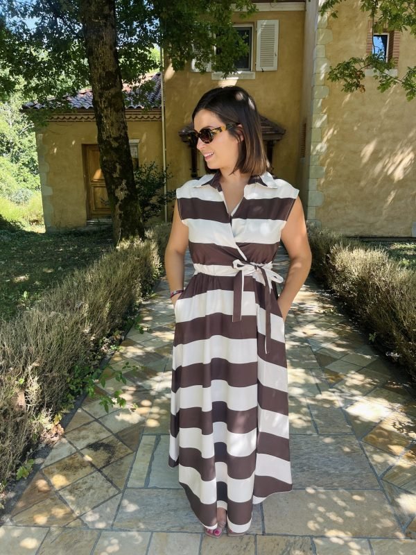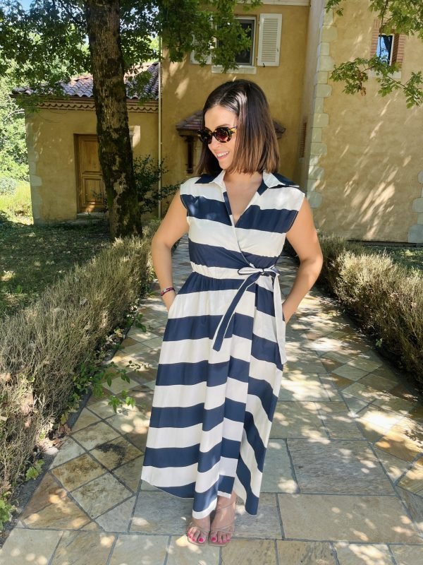 Avec ses larges rayures bleu marine et chocolat notre robe MIRA évoque une élégance intemporelle aux accents marins. Sa coupe portefeuille flatte toutes les silhouettes grâce à sa ceinture à nouer, qui marque joliment la taille.