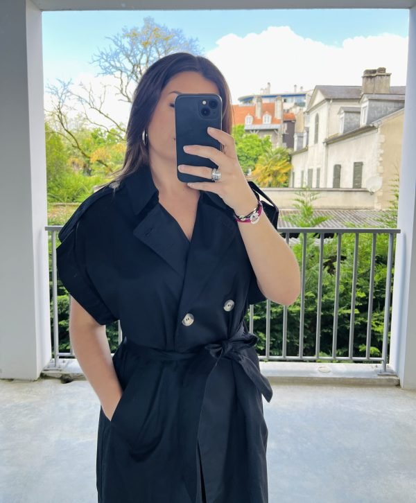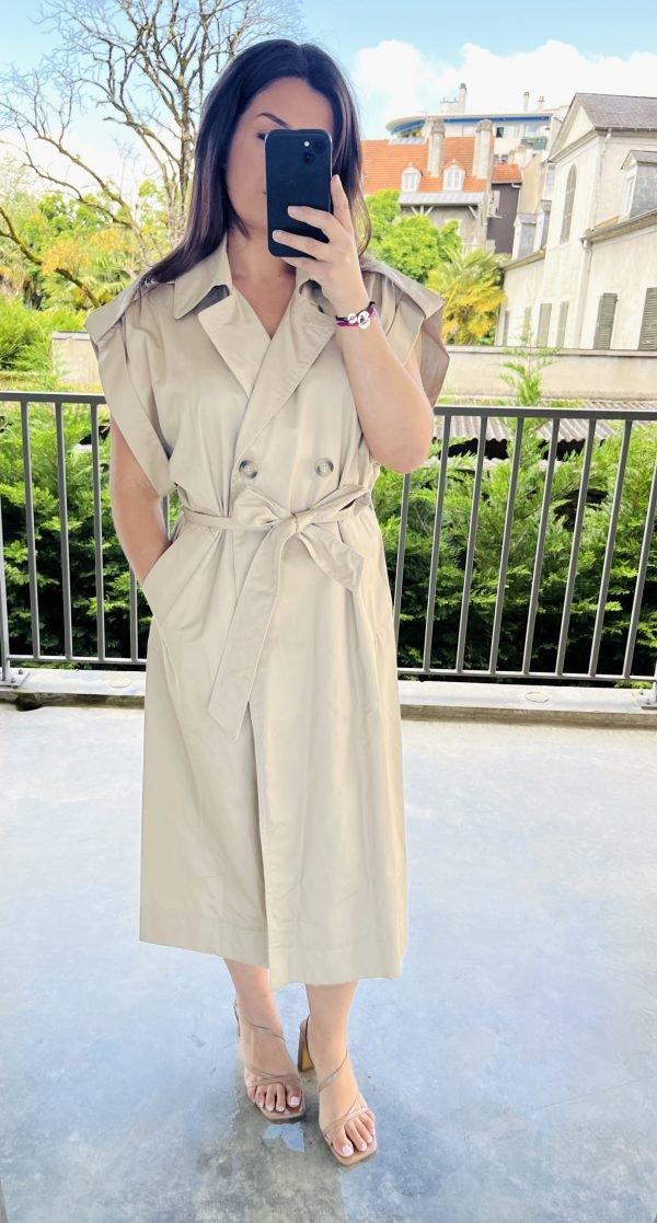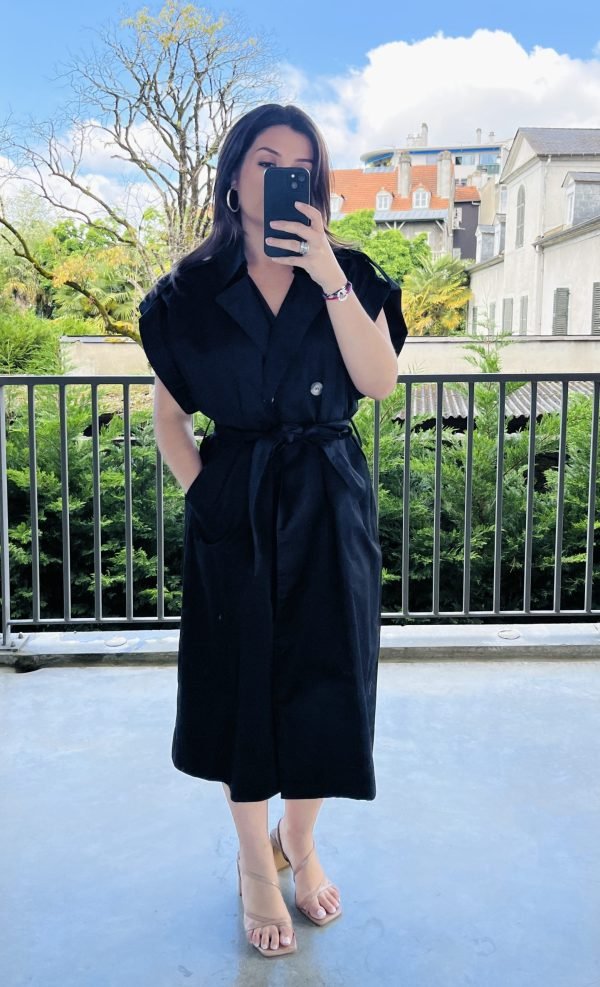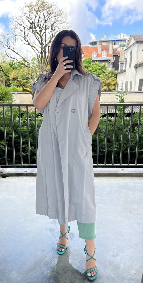 Élégant, structuré et résolument moderne, notre Trench sans manche type robe SAHARIENNE revisite les codes du trench classique avec une touche minimaliste. Conçu sans manches, Il est idéal pour la mi-saison ou pour superposer sur un look chic. Son col à revers large, sa fermeture croisée boutonnée et sa ceinture à nouer à la taille sculptent la silhouette avec raffinement. Ses épaules tombantes à rabats renforcent son style affirmé, tandis que ses grandes poches latérales ajoutent praticité et décontraction.