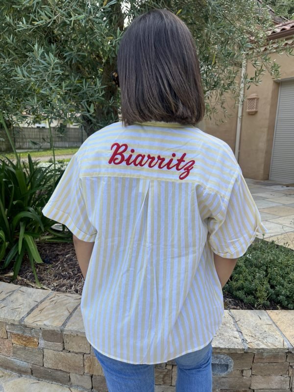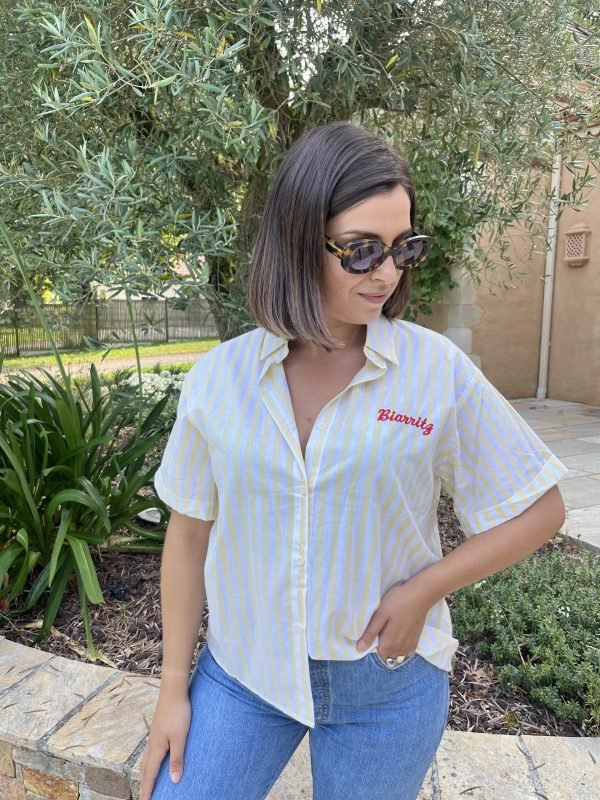 Avec son esprit vacances et sa coupe casual, notre chemise Biarritz est une véritable ode à l’été. Rayée jaune et blanche et bleu et blanche, elle se distingue par sa broderie rouge “Biarritz” côté cœur, clin d’œil solaire à la côte basque. Légère et douce, en coton respirant, elle se porte aussi bien ouverte sur un maillot que rentrée dans un jean pour une allure effortless chic.