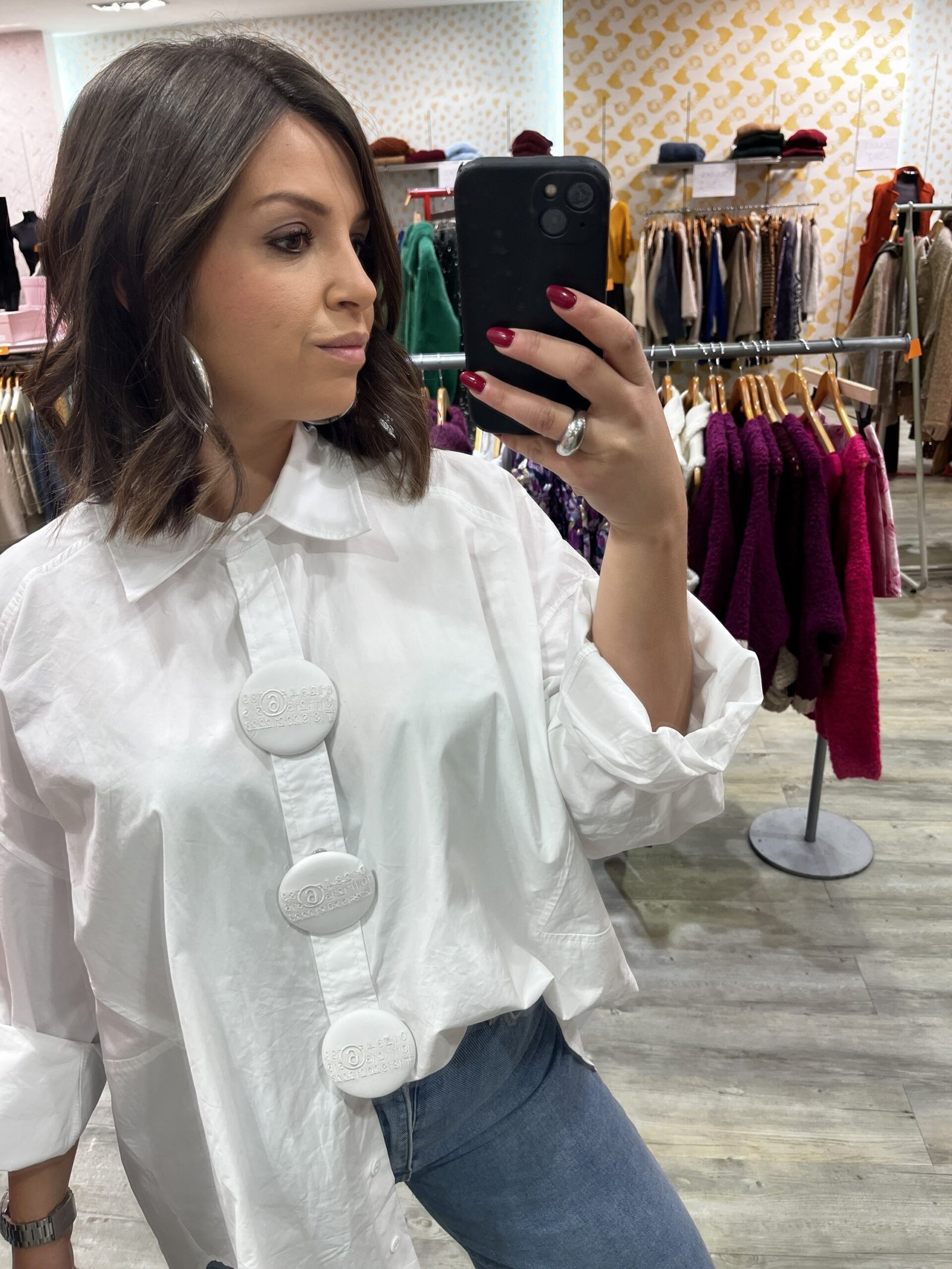Fermeture boutonnage classique sur le devant et trois gros boutons pression originaux façon pin’s pour la touche fun.